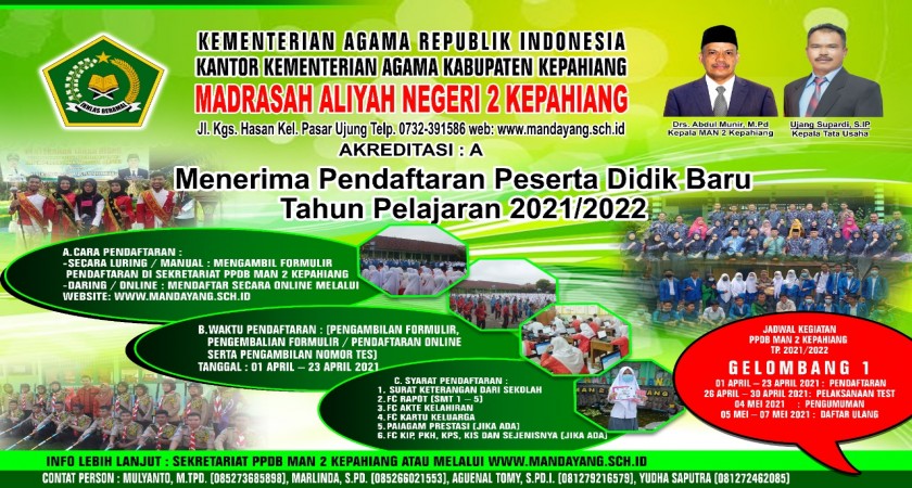 Berdasarkan hasil Rapat Seluruh Dewan Guru, Staff TU dan Komite MAN 2 Kepahiang, mulai 1 April 2021 menerima pendaftaran Peserta Didik Baru Tahun Pelajaran 2021/2022 dengan jumlah kuota sebanyak 6 rombel (216 siswa). Untuk tahun ini pendaftaran dilakukan dengan 2 (dua) cara Pertama : yaitu secara manual (luring) dimana calon peserta didik datang langsung ke sekretariat PPDB MAN 2 Kepahiang untuk mengambil formulir pendaftaran. Kedua yaitu secara online (daring) dimana calon peserta didik mendaftar secara online dengan cara mengisi formulir secara online kemudian mencetak bukti pendaftaran yang dikirim ke email yang didaftarkan.
